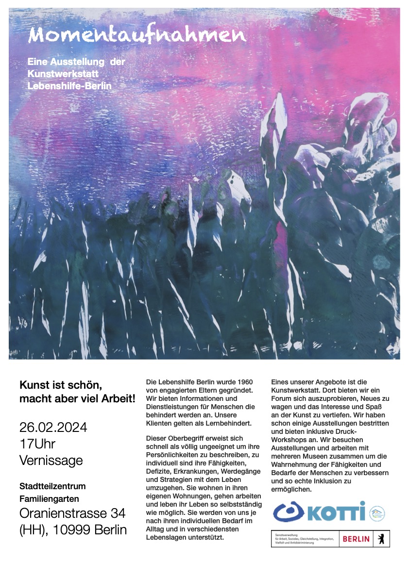 Ausstellung im Café Bethesta.Beteiligung an der Werkschau der Kunstgruppen der Lebenshilfe Berlin anlässlich des 50 jährigen Jubiläums in der Galerie Art-cru